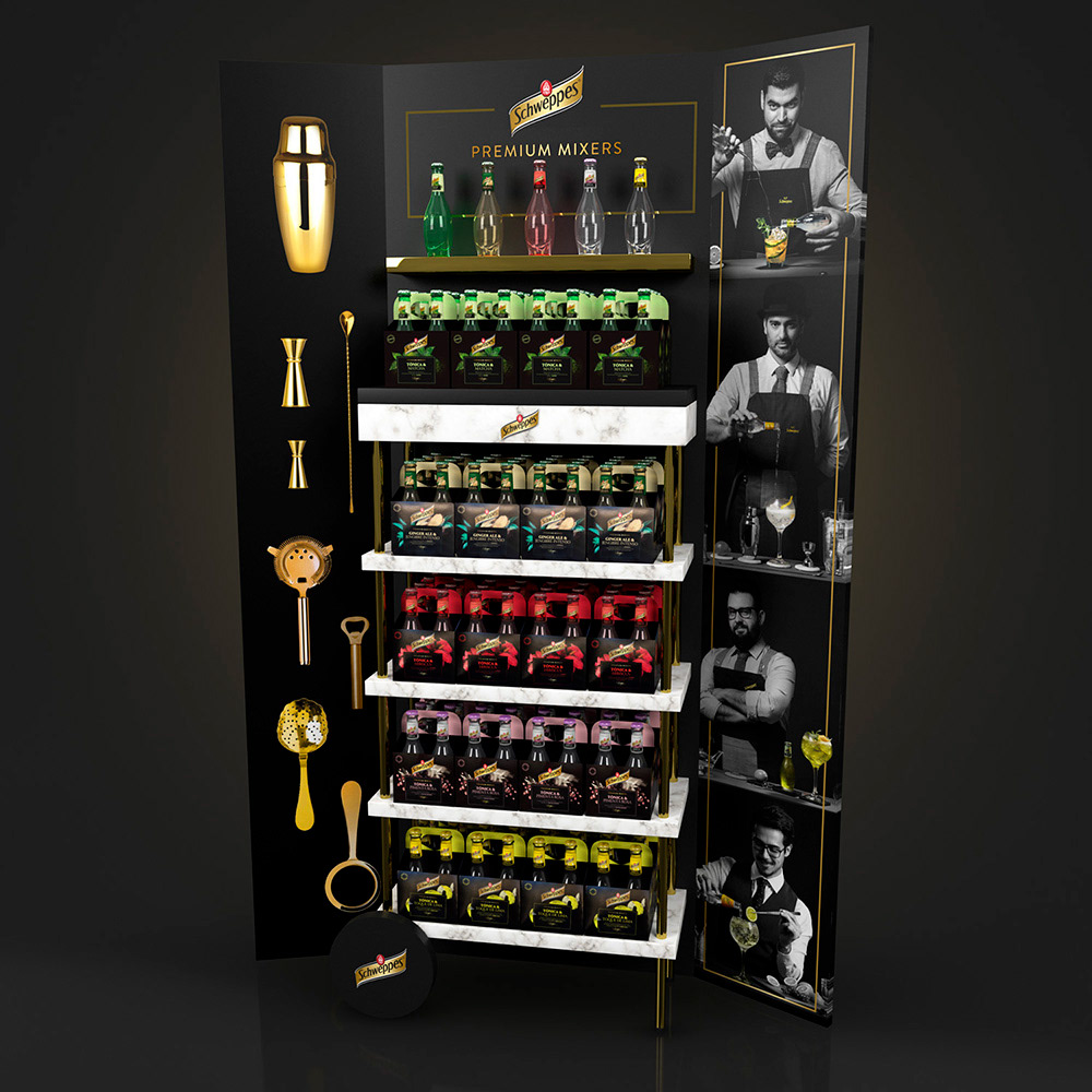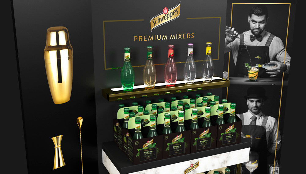Expositor para Schweppes Premium Mixers con forma de camarera, presentando a los nuevos Mixing Master de Schweppes.