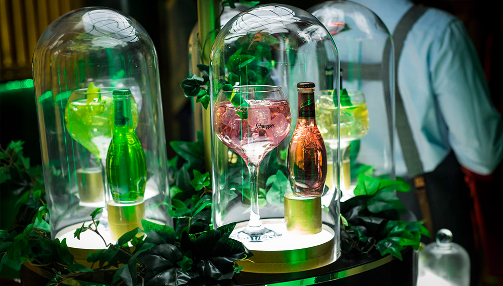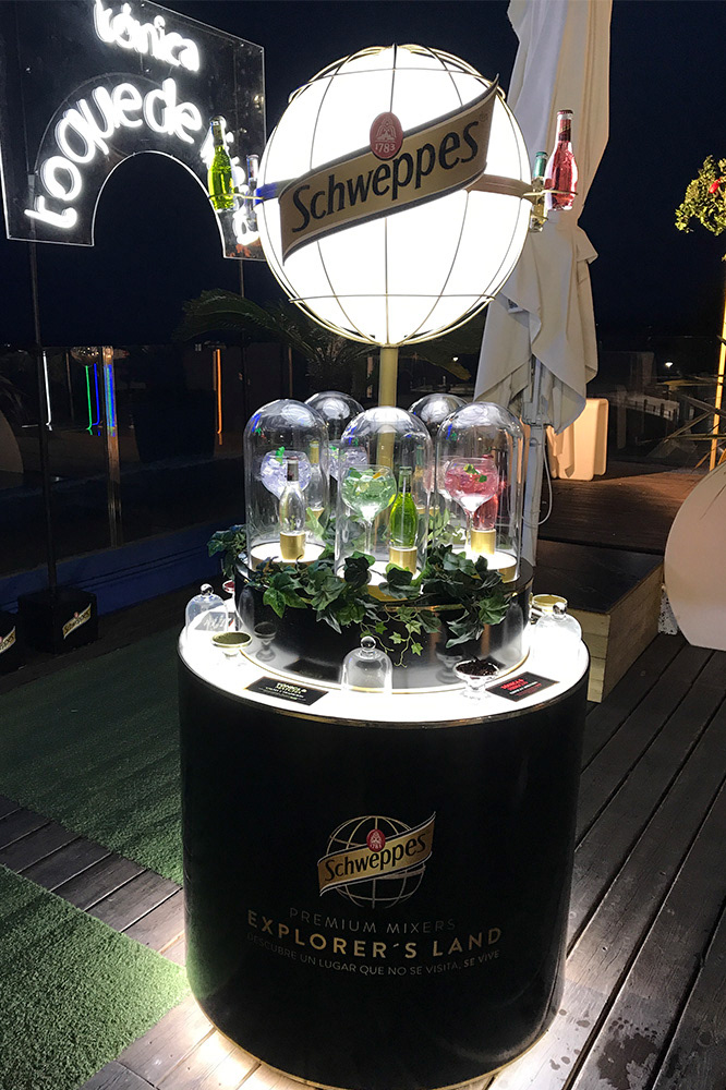 Diseño de la Station de Schweppes. Esta Station es un centro circular en el que los asistentes pueden conocer, ver, oler y palpar los ingredientes principales de cada variedad. Realización también de los Artes finales.